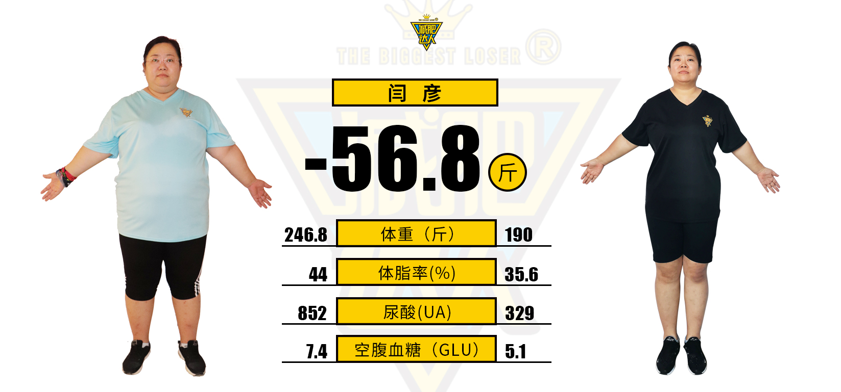 训练是艰苦的,但是从身体酸痛到情绪变化,她都有蔡培霞教练事无巨细的指导和陪伴。于是,闫女士得以以最好的状态,投入到每天的训练中,一步步接近心中的目标,成功减重56.8斤。